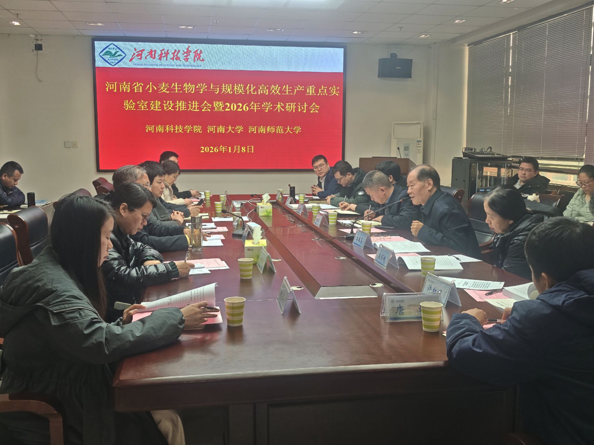 1月8日上午,河南省小麦生物学与规模化高效生产重点实验室(以下称实验室)建设推进会暨学术研讨会在我校12号楼708会议室顺利召开。副校长胡铁柱,重点实验室主任茹振钢,实验室共建单位代表河南师范大学生命科学学院、河南大学农学院相关代表,我校农学院、实验室与设备管理相关负责人,重点实验室各研究方向骨干共计30余人参会。