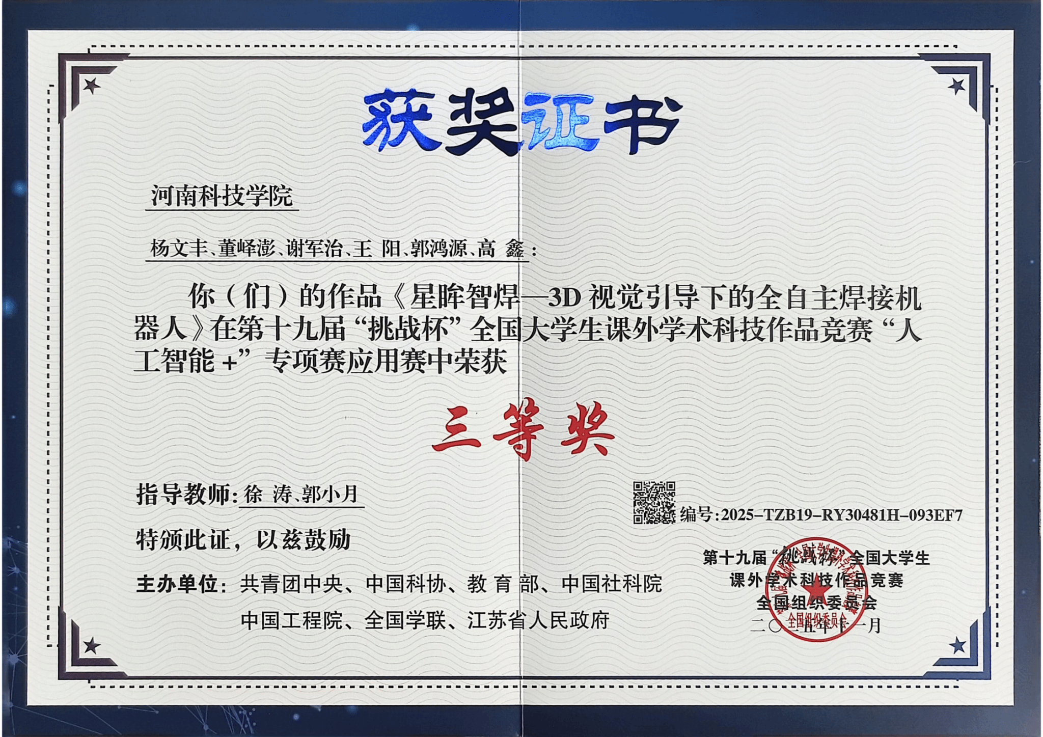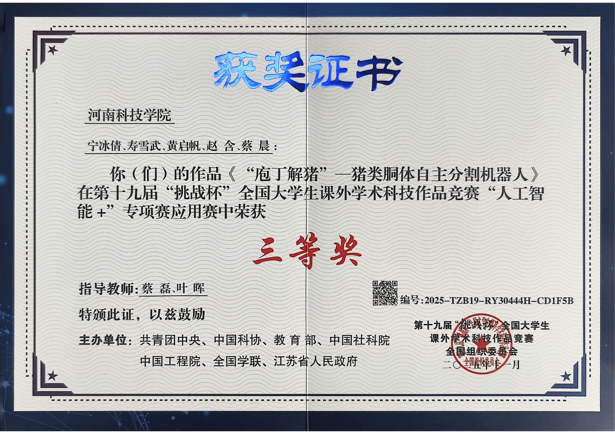 日前,由共青团中央、中国科协、教育部、中国社会科学院、中国工程院、全国学联和江苏省人民政府共同主办的第十九届“挑战杯”全国大学生课外学术科技作品竞赛落下帷幕,本次竞赛设主体赛、“人工智能+”专项赛、“揭榜挂帅”专项赛等赛道。我校计算机科学与技术学院《基于时空耦合物理引导的新能源汽车电池管理系统》获得“人工智能+”专项赛二等奖,人工智能学院《“庖丁解猪”——猪类胴体自主分割机器人》《星眸智焊---3D视觉引导下的全自主焊接机器人》获得“人工智能+”专项赛三等奖,实现了我校在“挑战杯”国赛中获奖数量的突破。