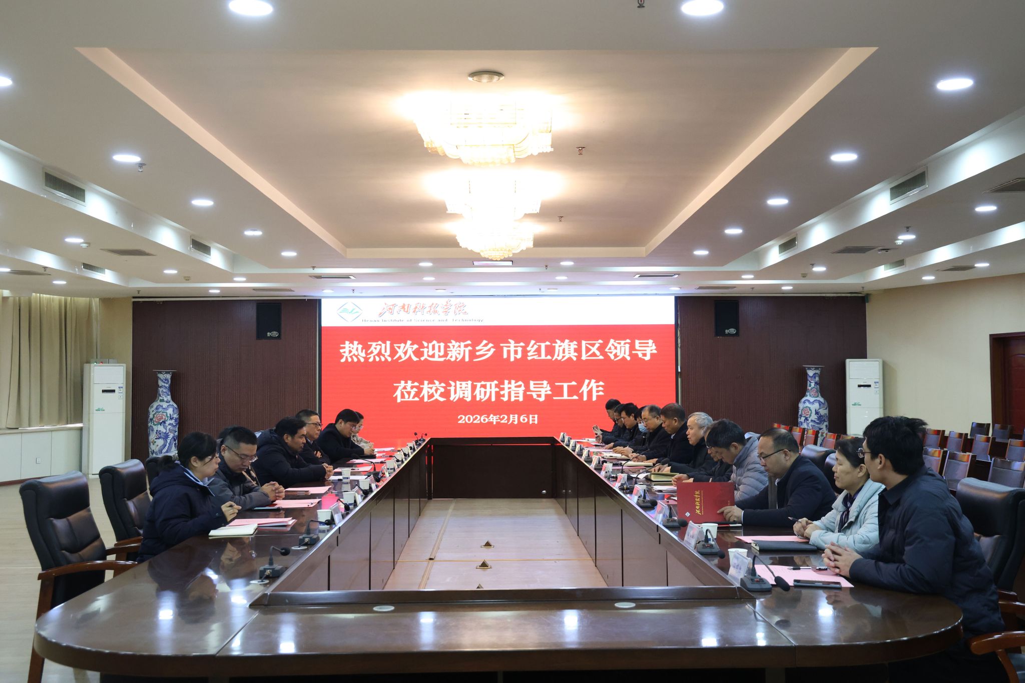 2月6日上午,新乡市红旗区委书记刘宏锋一行莅临我校走访慰问,座谈会在办公楼206会议室举行。校党委书记宋亚伟、党委副书记王庆兵出席会议,党委办公室、校长办公室、党委组织部、党委宣传部、党委统战部、校纪委、科技处、保卫处、成果转化与合作办公室、杂交小麦工程技术研究中心等部门负责同志参加座谈会。会议由王庆兵主持。