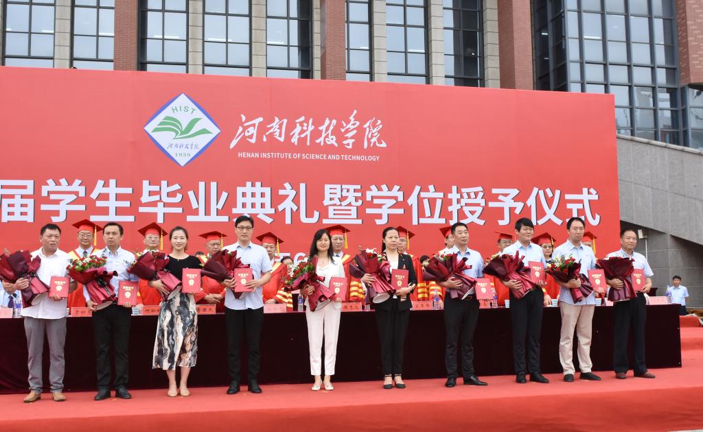 在毕业典礼现场,通过各单位推荐、评选出的2021年科院最美教师、最美辅导员和最美后勤员工纷纷上台。校领导为他们颁发荣誉证书,毕业生代表为他们献花,感谢所有教职员工为学校的发展做出的努力和贡献。