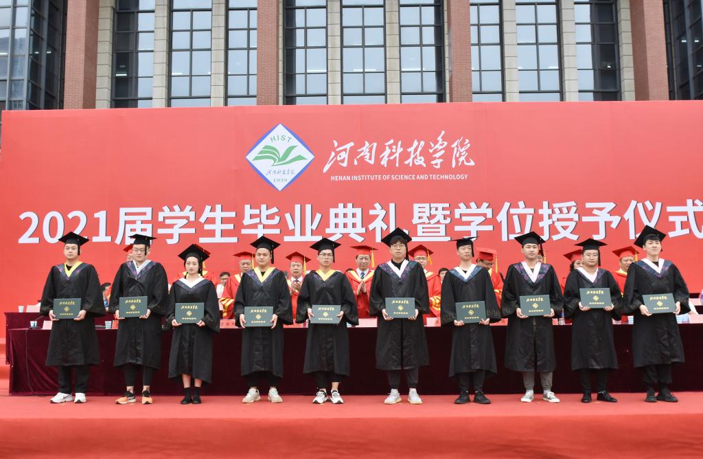 在热烈的掌声中,校领导为2021届毕业生扶正流苏并颁发学位证书。
