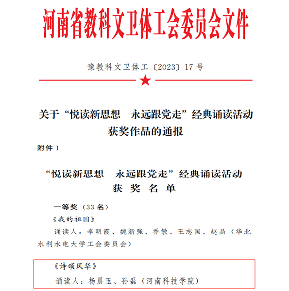 近日,河南省教科文卫体工会发布了《关于“悦读新思想 永远跟党走”经典诵读活动获奖作品的通报》,我校教师杨晨玉、孙磊朗诵的《诗颂风华》荣获一等奖,我校荣获优秀组织奖。