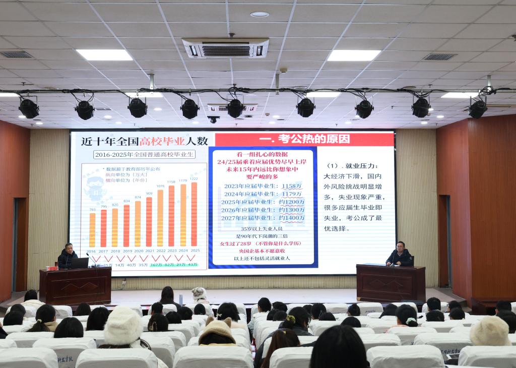 为了帮助2025届毕业生加强对河南省非定向选调生、公务员招录的了解,解决备考疑惑,提升实战能力,12月27日上午,我校在图书馆学术报告厅举办河南省2025非定向选调、公务员招录备考专题讲座,邀请河南师范大学陈灿副教授担任主讲嘉宾,各学院200余名学生参加会议。本次讲座由就业创业指导中心副主任李月涛主持。
