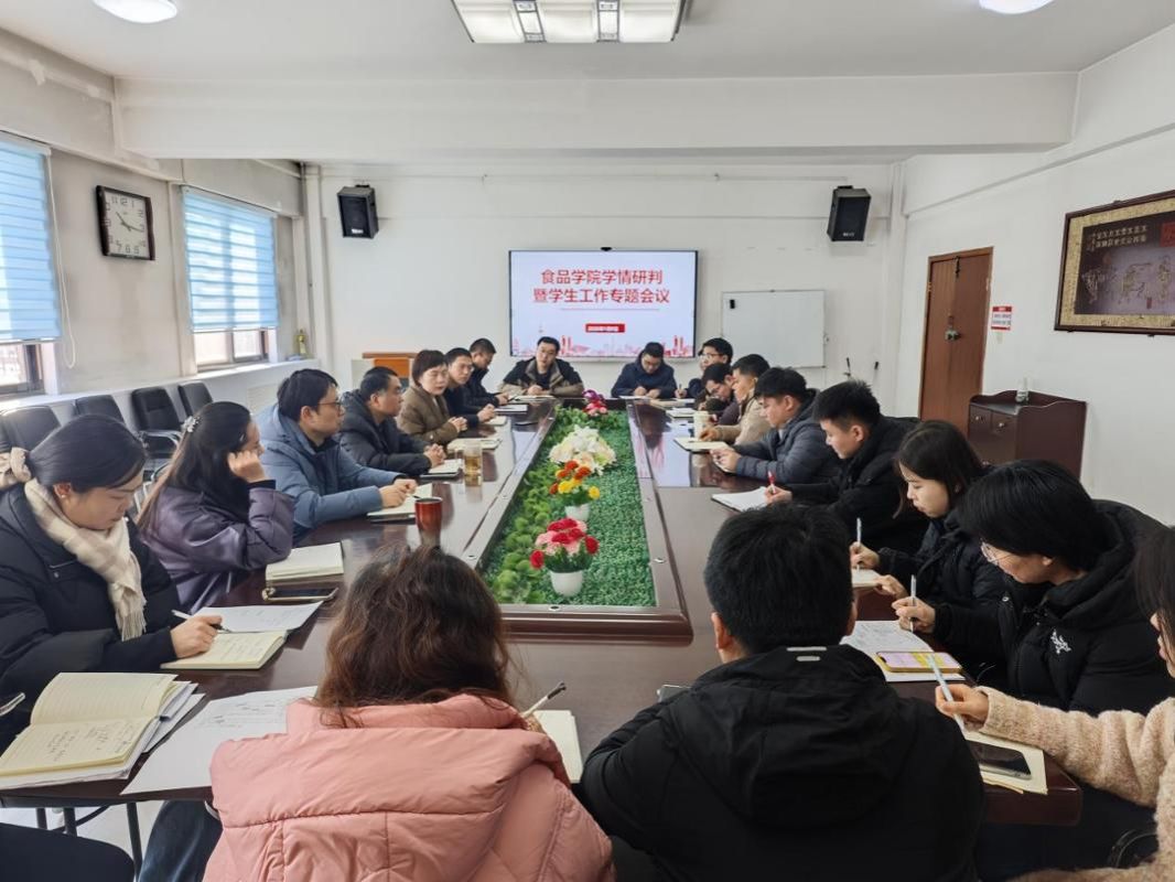 为精准把握学情动态,统筹推进学生教育管理工作,1月9日上午,食品学院在304会议室召开学情研判暨学生工作专题会议,会议由学院党委书记陈腾主持,学院全体领导班子、各专业负责人、全体辅导员及专业教师代表参会,会议聚焦毕业生实习、学生日常管理、宿舍安全、心理健康等重要议题展开深度研讨,明确工作方向与落实举措。