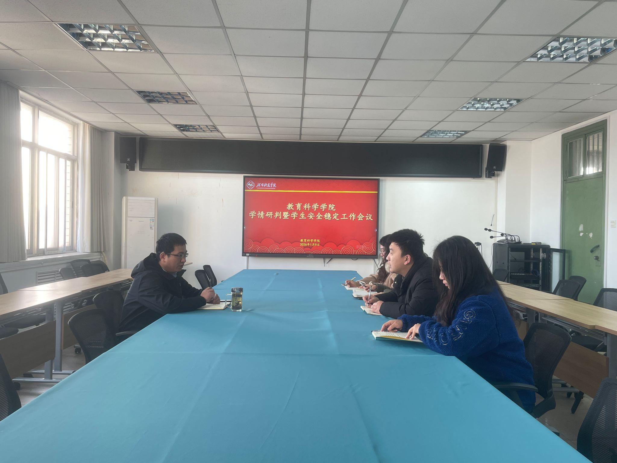 1月9日下午,教育科学学院在0号楼906会议室召开学情研判暨学生安全稳定工作会议,学院党委书记刘晓杰,学院党委副书记李鹏,全体辅导员参加会议。