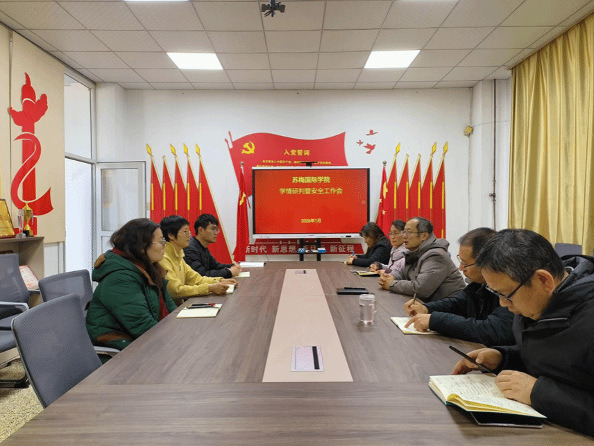 为全面加强期末学生安全稳定工作,切实保障师生身心健康与校园和谐有序,1月8日上午,国际教育学院(苏梅国际学院)在博闻楼501党建活动室召开学情研判暨安全工作会议。学院党委书记张平、院长吴艳兵,党委副书记刘凤,副院长沈军、王君君,团委书记张宁宁、辅导员崔嘉欣和胡俊杰参会。