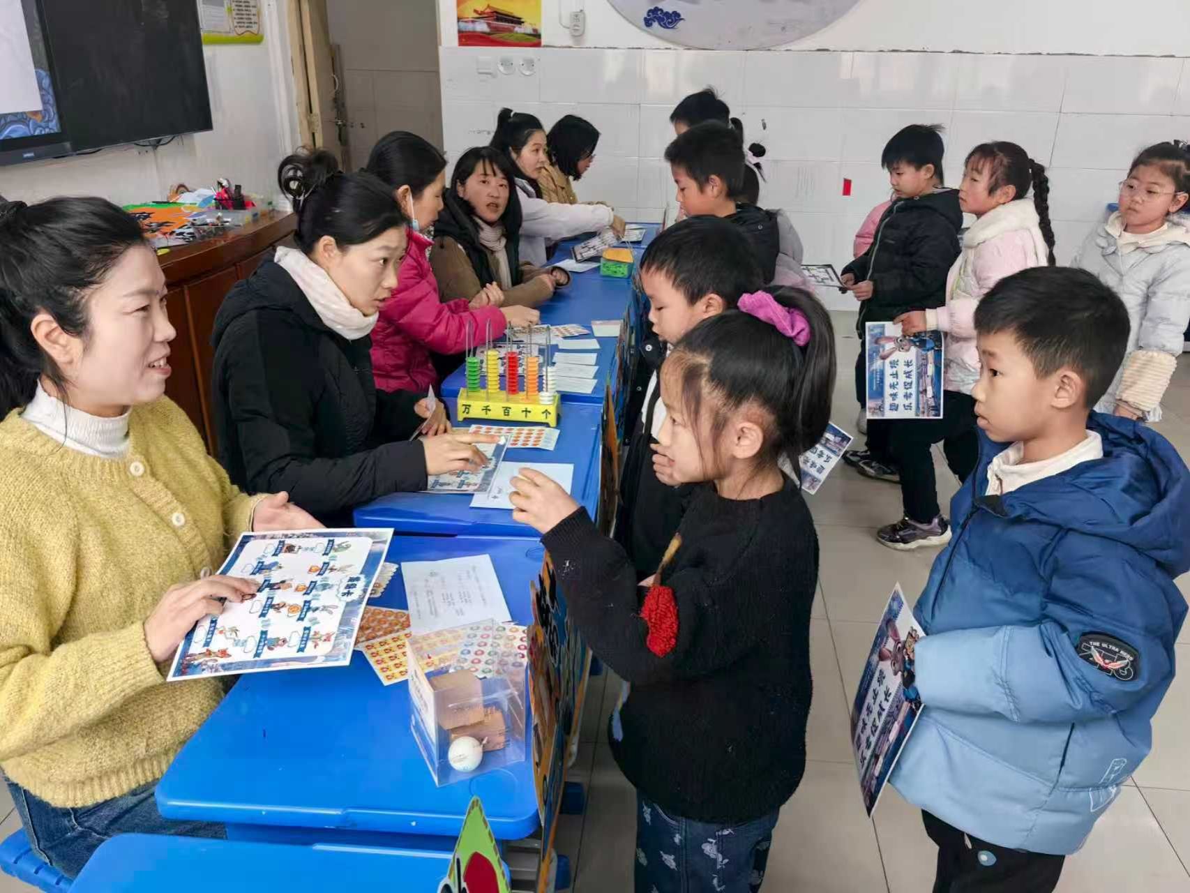 各测评区域内,孩子们手持精心设计的“集贴卡”,兴致盎然地穿梭于各个闯关点位之间。一年级“写话冲浪岛”“背诵欢乐谷”的语言表达闯关、“科学大闯关”的探索实践、“分类小达人”“生活小能手”的生活应用挑战,二年级“妙语连珠岛”“好词对对碰”的语言运用进阶、“口算小天才”“识图小达人”的数理思维比拼,各关卡环环相扣、趣味十足。孩子们或凝神思考、或大胆表达、或动手操作,在沉浸式闯关中完成知识与能力的综合展示,每通过一关,便收获一枚代表成功的“优”“奖”印章,集贴卡上的印记也随闯关进度渐渐丰富。