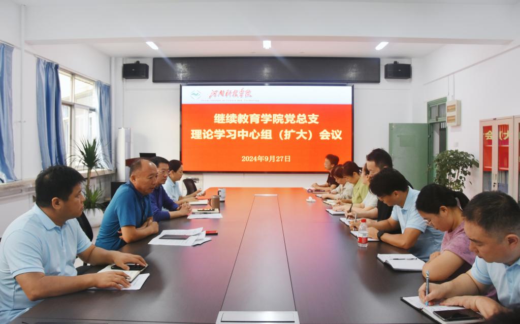 9月27日下午,继续教育学院党总支在综合实验楼D202会议室召开党总支理论学习中心组(扩大)学习会议,学院班子成员、全体教工参加会议。会议由党总支书记郭东升主持。